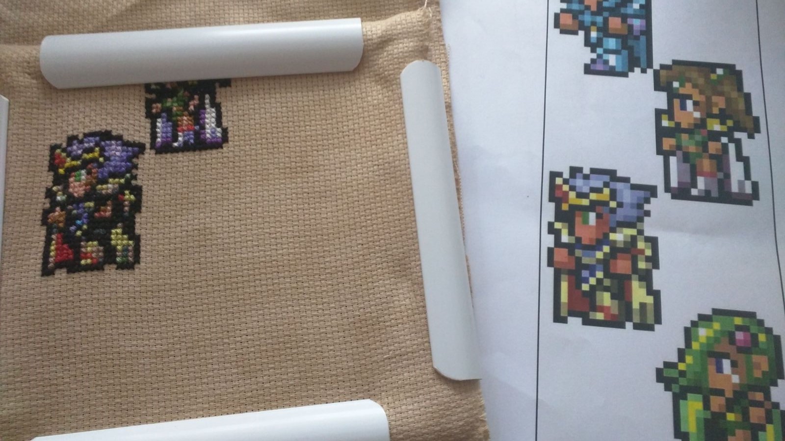 So I've been asked to do an FFIV cross stitch for a friend of a friends. No problem. House mate helped me capture the specific way they requested the characters to be in and make it like this: