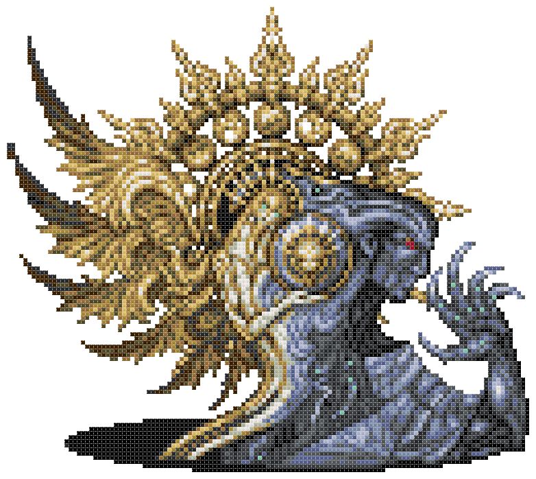 I took your picture, edited and resized it to be 1 block = 1 stitch (a lot of FF sprites, especially the big ones from ATB etc, have 4 pixels as 1 block but that would have been 2x the stitching!) I also picked out some better colours than the ones PCStitch wanted, but feel free to change them if you find something better!