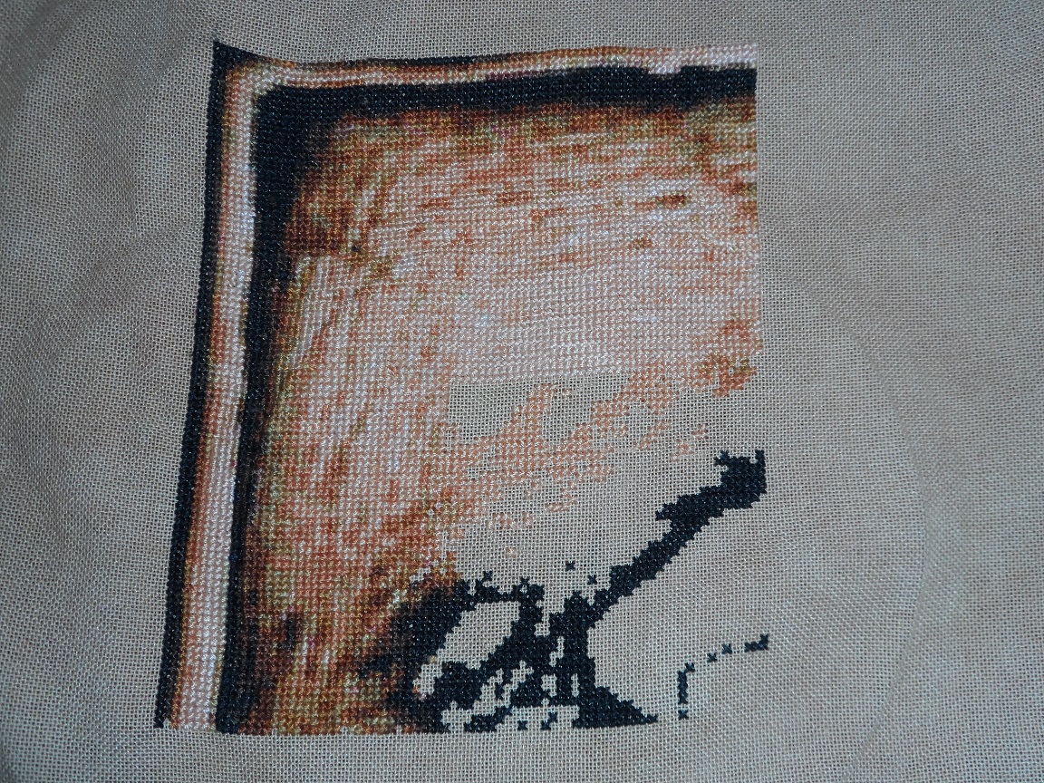 It's been a loooooong time since I've posted anything.....or stitched anything. I've been super busy these last few years getting married, going back to college, and getting obsessed with knitting. I'm working on a Dr. Who scarf for a friend that's almost done so I'm getting anxious to start something big cross stitch wise. There's been a project on the back of my mind I've been wanting to stitch and I finally have the resources and ambition to do it. It's this (https://www.etsy.com/listing/480769142/ ... ve_5&frs=1) pattern. It's a HAED pattern and it's HUGE!! The fabric I'm stitching it on is 36 ct over 2 and it's going to be about 32x41 inches. It's the biggest thing I've ever attempted to stitch and I'm nervous. I've made a start on it and this is day 1 of stitching.