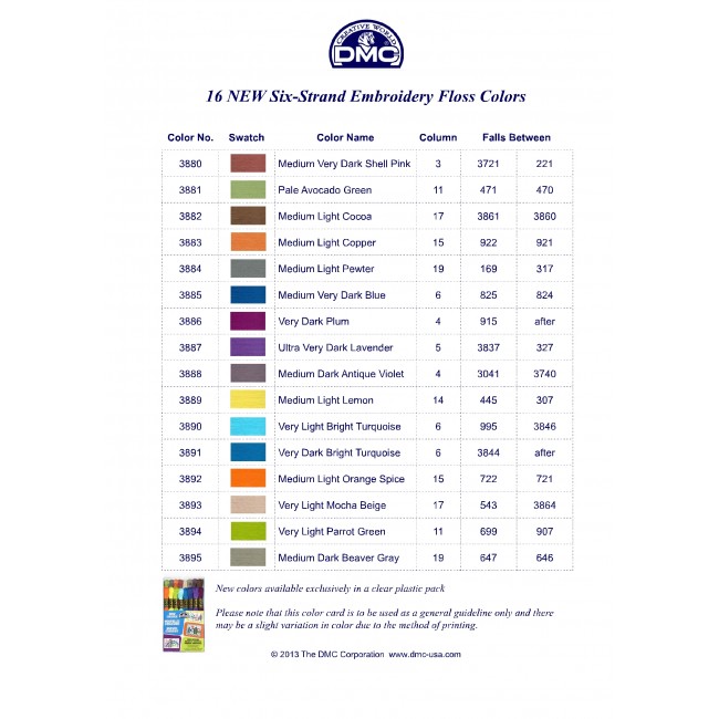 (ex: 367 Pistachio Green - DK) http://www.camelia.sk/dmc_1.htm