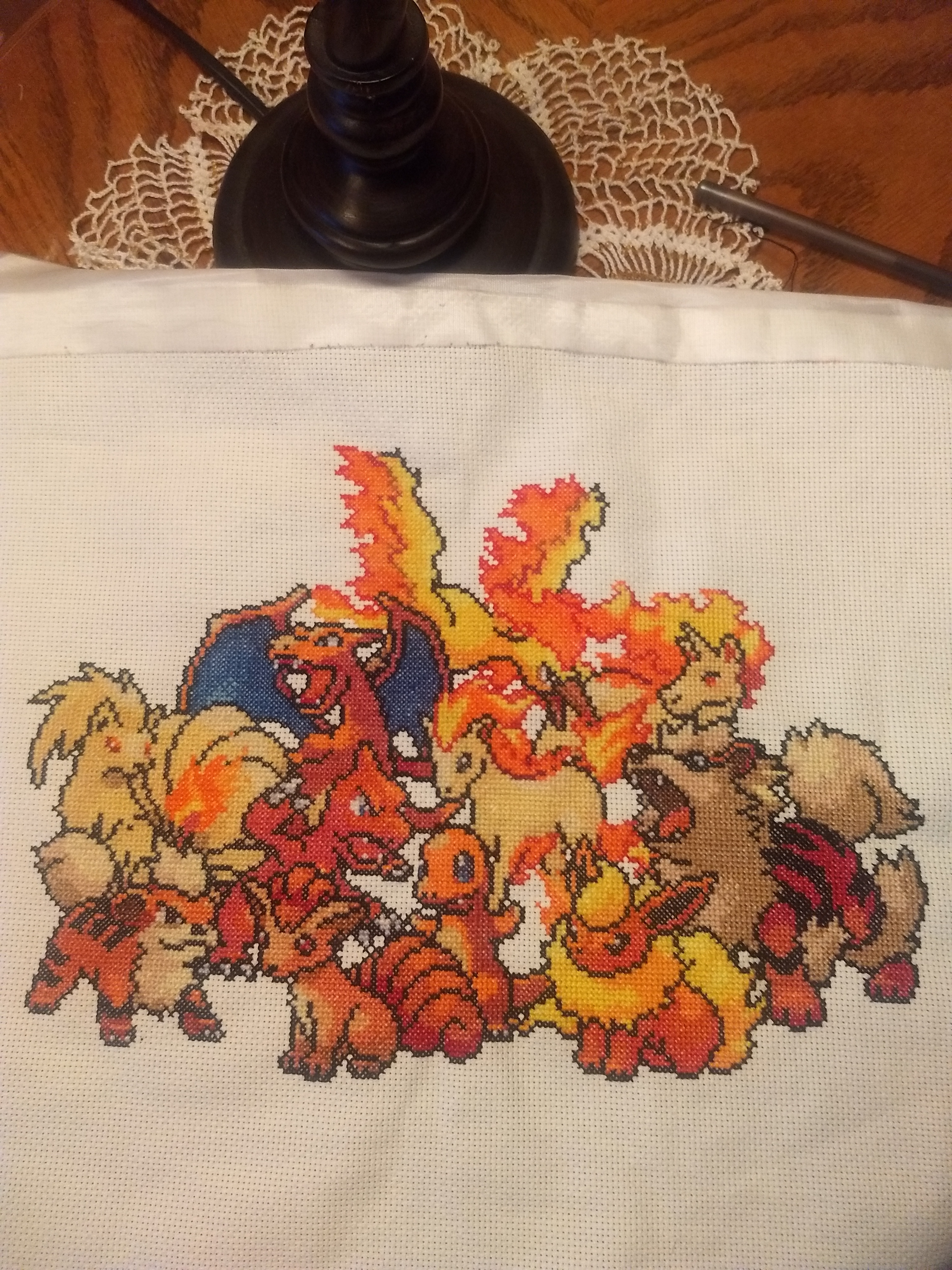 My request! I ended up adjusting the colours quite a bit, and used a mix of DMC and Sullivans to get enough range of creams and oranges. I have my printout with the final floss colour numbers around here somewhere if people are interested. They were picked for a navy background, but they should look ok on light colours too. If people like the pattern maybe I should add in Magmar and update the pattern threadblackmageheart wrote:Actually, that's not a LittleMojo pattern!