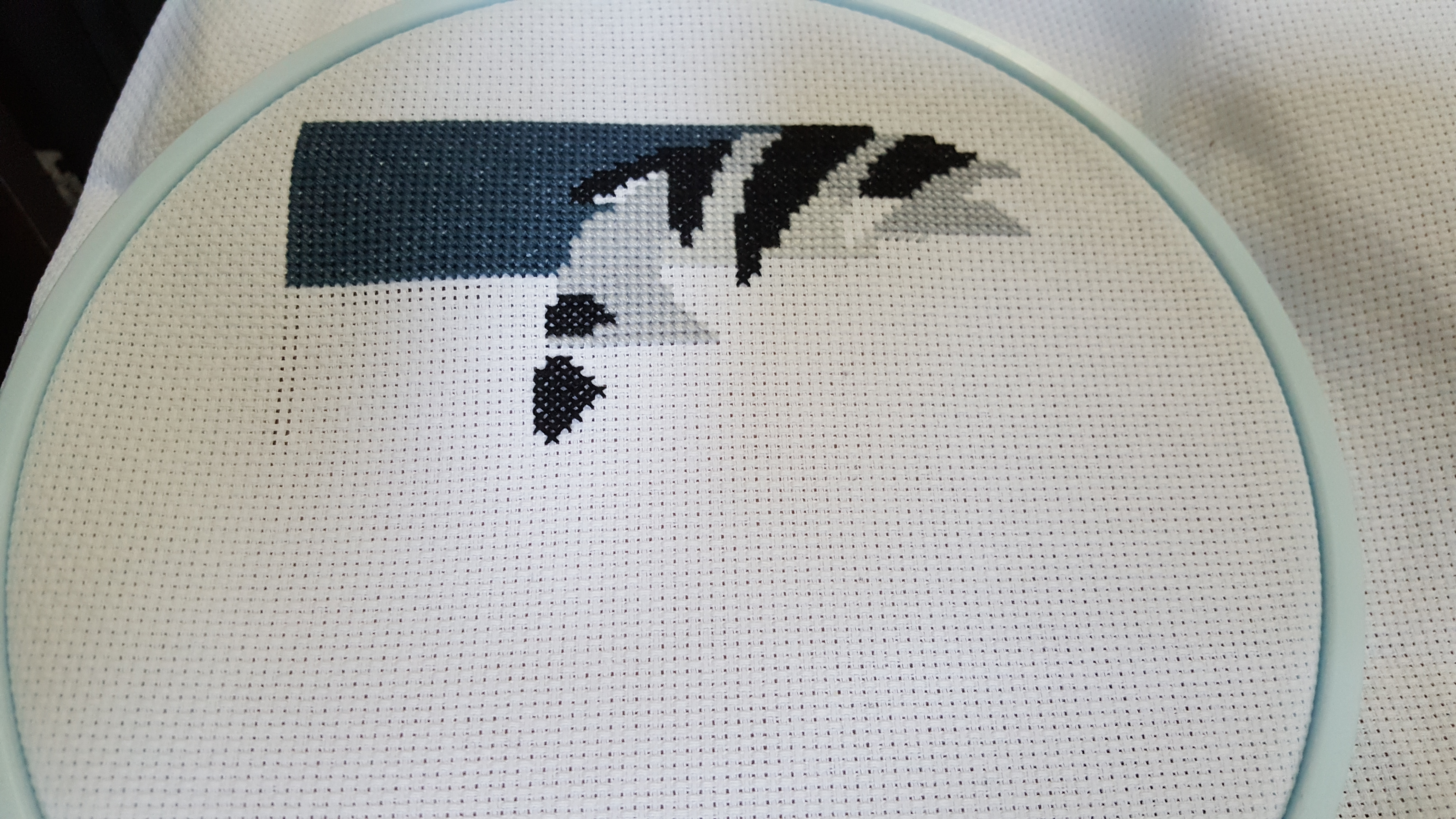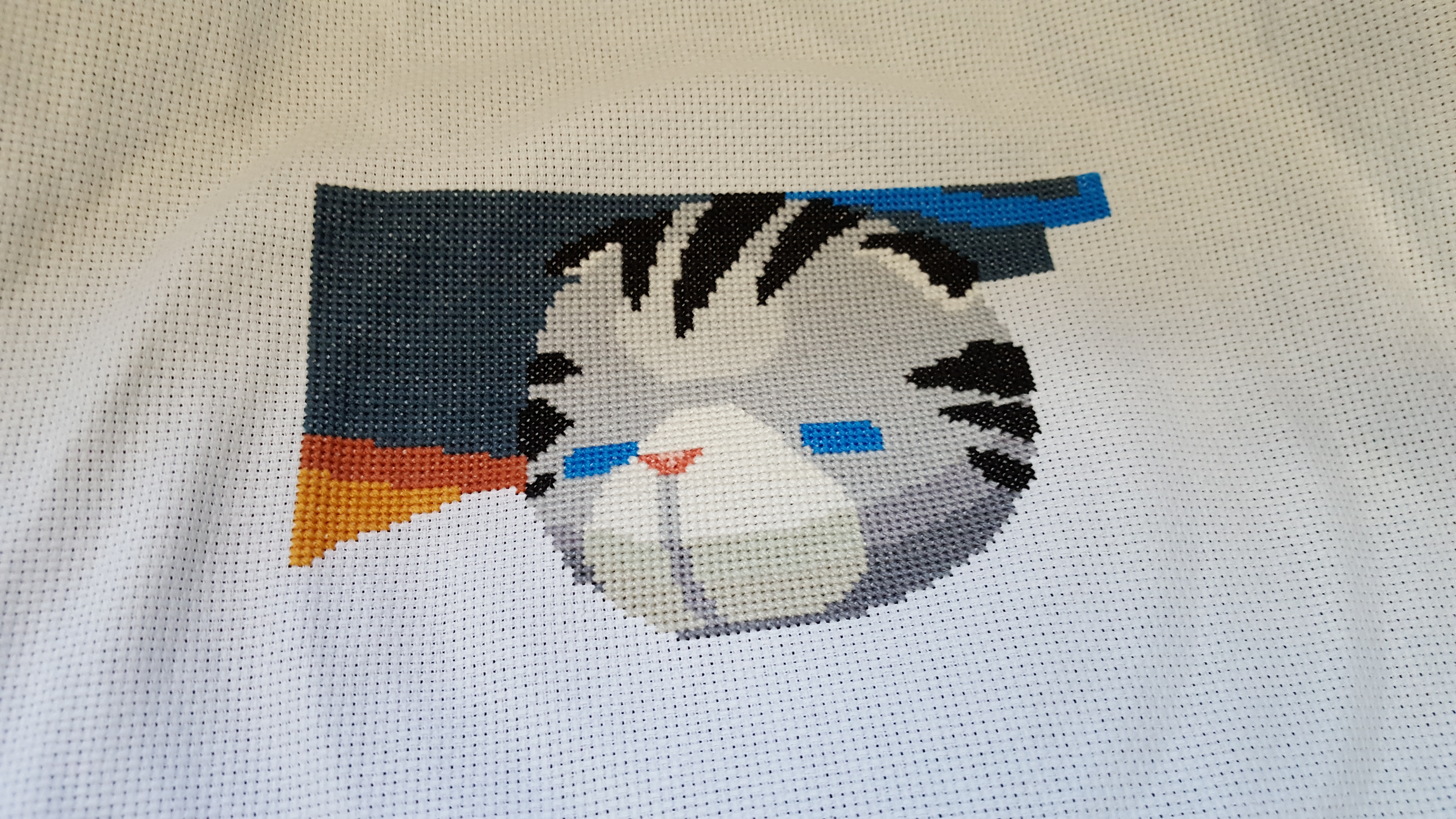 Chirithy's head is complete! I also reached the second corner of the pattern finally. I'm working on finding the right shadow color for his cape, since the one in the pattern is off (834 is way too bright for a shadow).