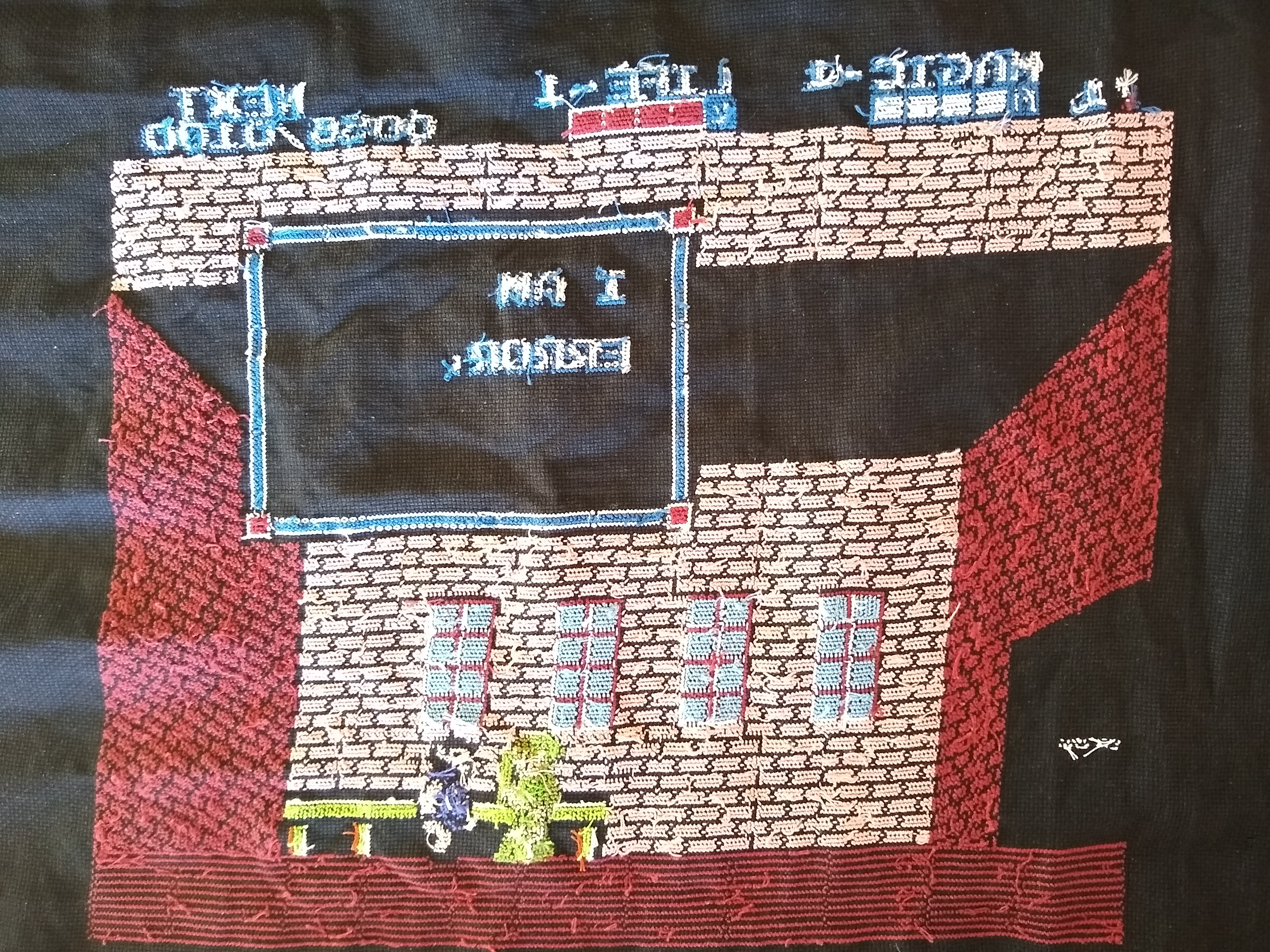 All right, last WIP picture until we're finished. As we can see, we've finished all the text, bricks, windows, everything except the table down there in the lower right corner (or would be the lower right corner if we could figure out how to get the picture to come out in the right orientation) plus Link and Error. Figure a couple of weeks should be all that it takes to finish up. It was about the end of January when I started this, so we'll be coming in at just about a year to do it, working about an hour a day, just about every day, though I did have, what, three breaks in there to work on other quick projects. So 10ish months actually spent working on it. But it'll be a while before I tackle another big one like this. I've got another 3 or 4 screenshots as potential projects, but those would likely take even longer because they have more stuff/less open space that doesn't need to be stitched. Instead, I've got a quickie project for Four Swords Adventure I'll likely do next. Have a pattern/threads set aside for an A Link to the Past project that's on the list. And one for Link's Awakening, but that'll require some French knots or something beyond just basic stitching. Which isn't a problem other than I'd have to look into/learn how to do that. I've also got a non-Zelda/non-gaming idea, but I'd have to come up with the pattern myself. So I might start messing with that, just getting some stuff on paper, just to get the ball rolling.