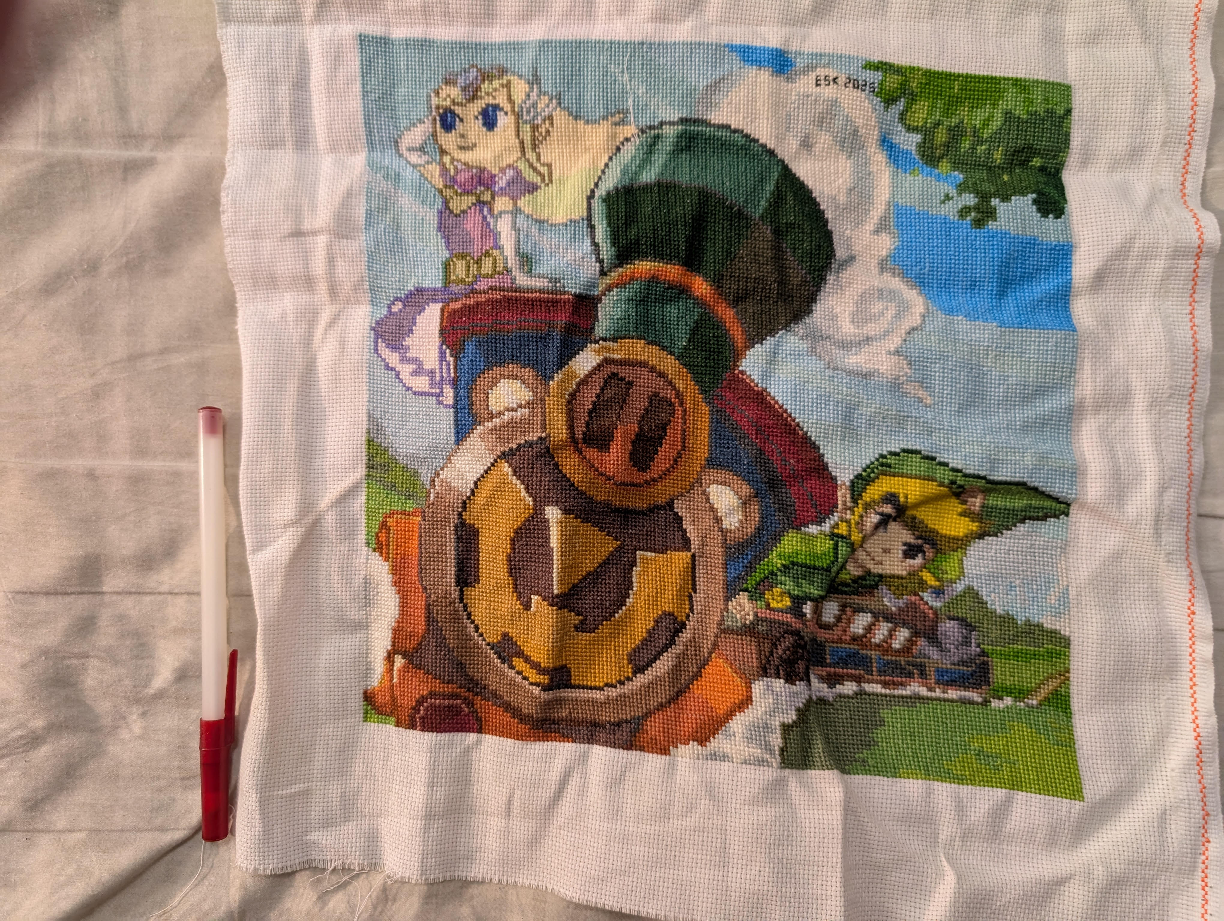 Spirit Tracks is getting finished next week without a doubt. Moved the hoop at the end of stitch time today, so upper corner is done. Also signed it since the white/blue of the clouds and sky up there made the black show up better than on the green of the trees/leaves. Also learned that despite this picture using 80 gazillion colors, black was not one of them. Have plenty of black on hand, so not an issue, but 310 Black is not used anywhere in the picture. But yeah, hoop is in the bottom right corner, have roughly 1200 stitches to go. And much of that is a couple of colors of green, so I'm fully expecting to finish next Tuesday or Wednesday.