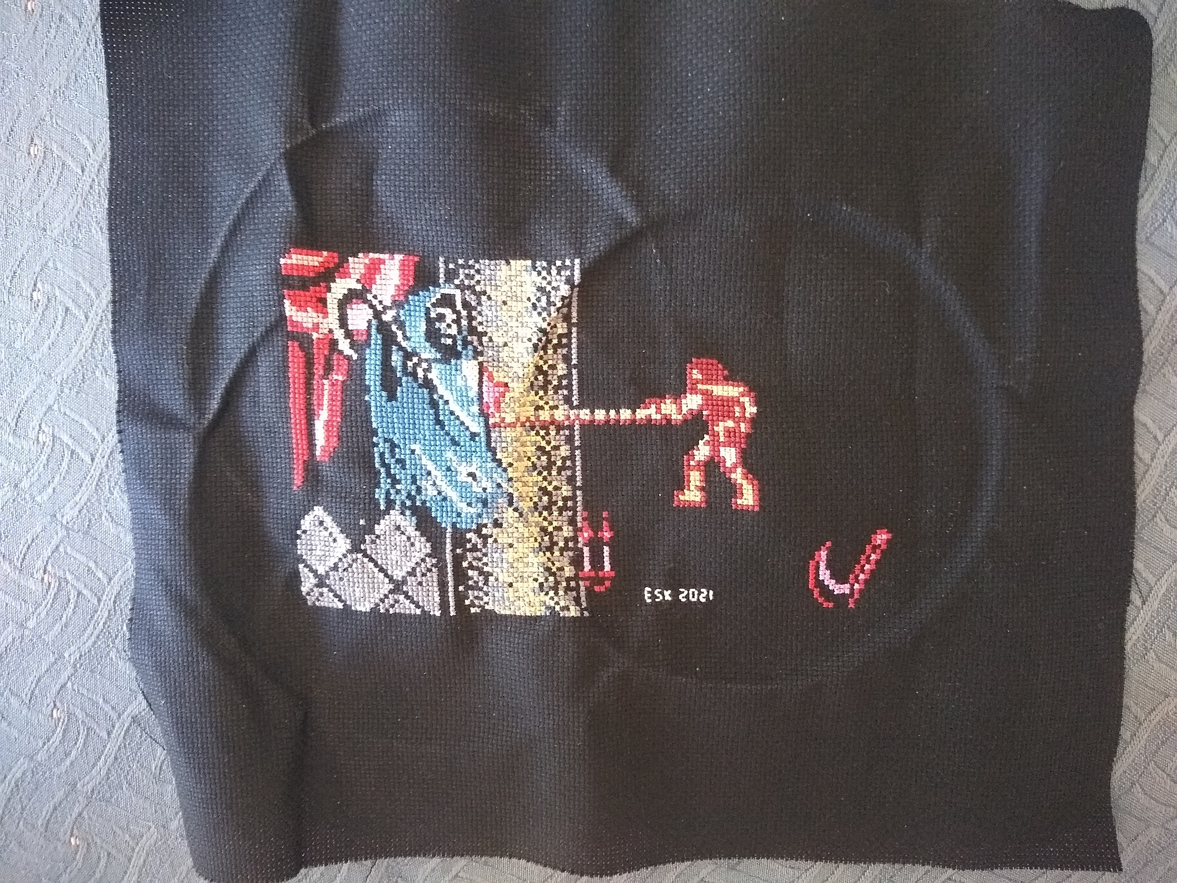 So, for our project, we're working on the attached. Castlevania is certainly a well known series, so that should help the sale. And if not, I'm a fan of the series, so would have no problem with it on my wall, or as I said, donate it as a prize. But I was able to find a nice action shot from the first game, cropped out some of the extra stuff, leaving what we've got. We're a little over a week in and making good progress. First few days were just the grey diamonds in the corner, so that was a little disappointing in my progress. But since then, we've gotten most of Death done and have started in on the pillar. Most of this week will be spent on the pillar, but I think I can finish up Simon (our hero), Death's head, the curtains and such next week. That's my tentative goal. However, since both the gaming shop and The Artery are closed Sundays and Mondays, if I can't finish by the 14th without doing lots of extra work, I've got a couple of days to work that I can't turn it in anyway. But still shooting for the 14th. Went up to Michael's last week to pick up the light red for the curtains and got a couple of possibilities. Once I get some of the bright red in, I'll see what actually works/looks better. But happy with the other colors I've chosen thus far.