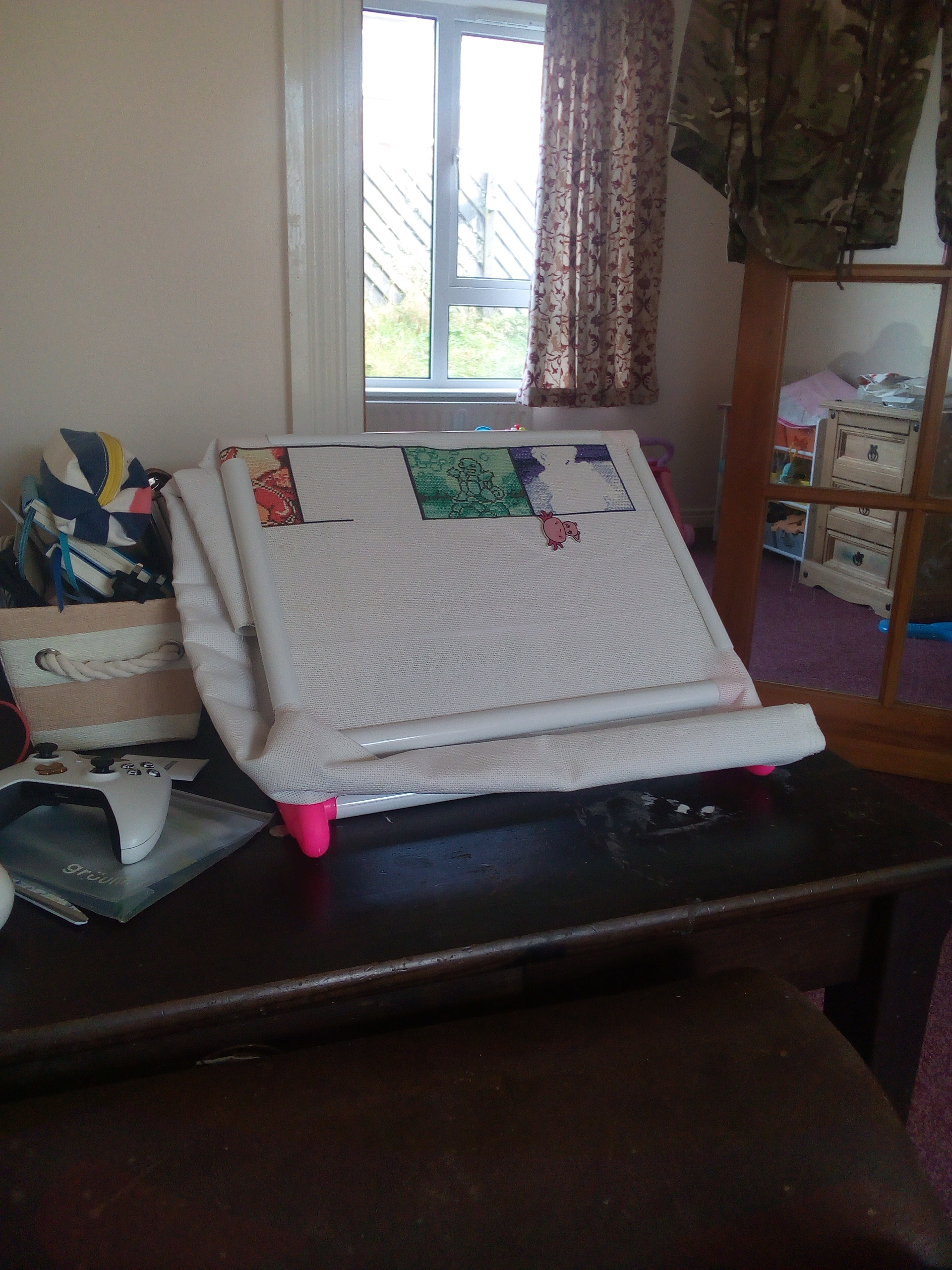 The way that I wanted to lay it out was like the poster I had as a kid with the top row ending in caterpie... But the width isn't enough. So, I am getting another bit of fabric to overlap so I can fit thd last two coloumns in.