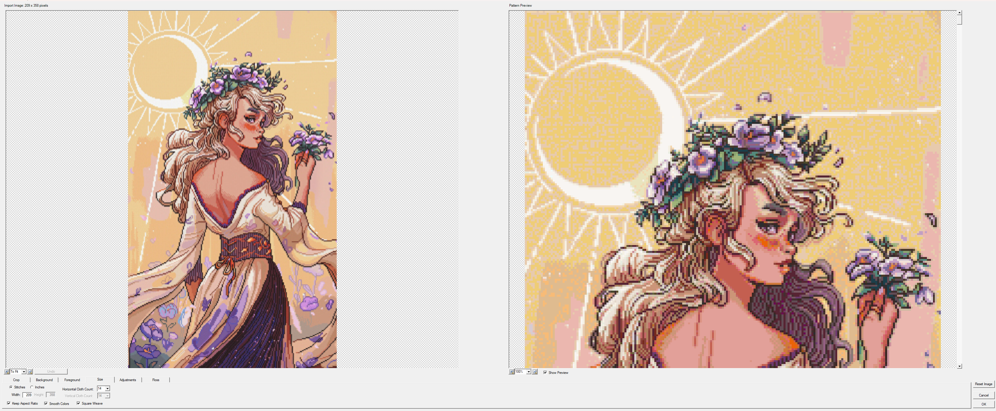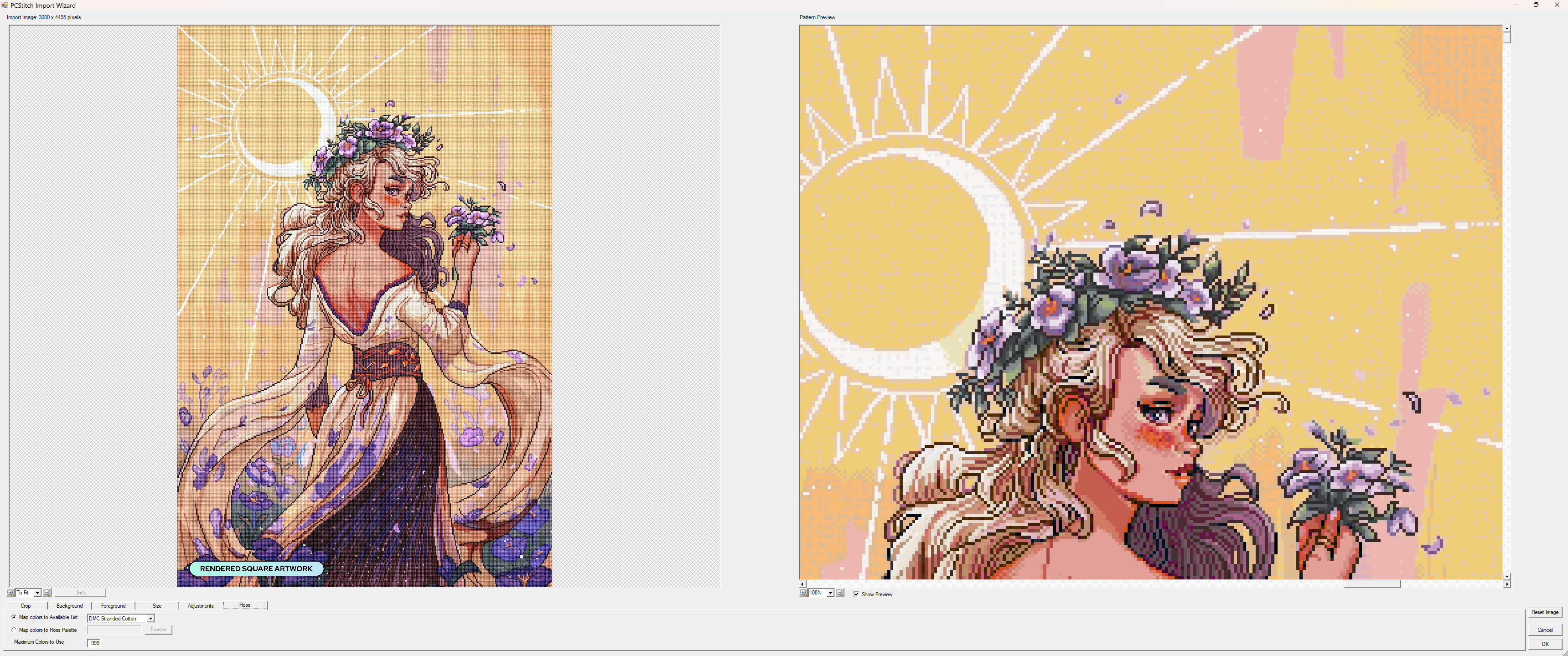 Would it be okay if I asked more about the progress? I would really like to learn a bit more so i can to that by myself :c I resized the image in photoshop to the amount of diamonds and then imported that to pcstitch and changed the size to the amount of diamonds but it still had those grey areas. If you could guide me a bit more in the process of what im doing wrong I would really appreciate it