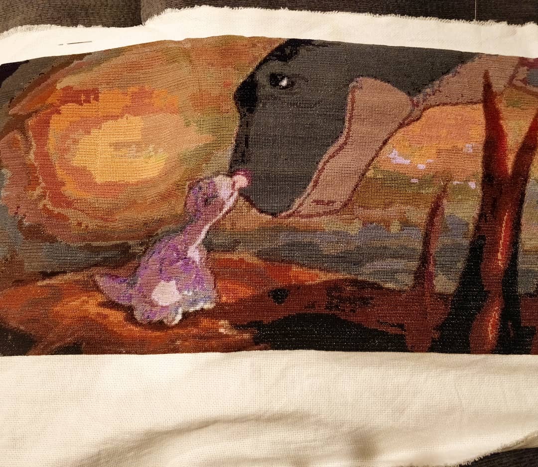 Hello! I would love it if someone could help me out with making a pattern of Littlefoot and his mother from the Land Before TIme for my nursery. We've been calling her Littlefoot through out my pregnancy so i thought this would be a nice touch to hang on the wall. I'm looking for 16-18 ct for Aida cloth, sizing I'm cool with fairly large, I want to keep as much detail as possible. Same with color count, as many as needed to keep the detail. Thank you!