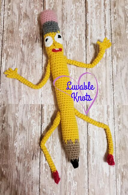 I used YouTube to teach myself to crochet almost 3 years ago, after I left my career to stay home with our spawns. I dove into using patterns, and looking stitches up as I went along. I finally wrote my first pattern that I published on ravelry. It's Pencilvester from the adult swim show, Rick and Morty.