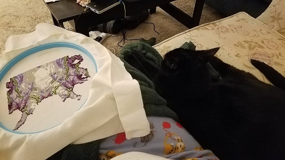 My baby Salem was keeping me company while I was working on my square. The tree is so close to being done, yet so far away!