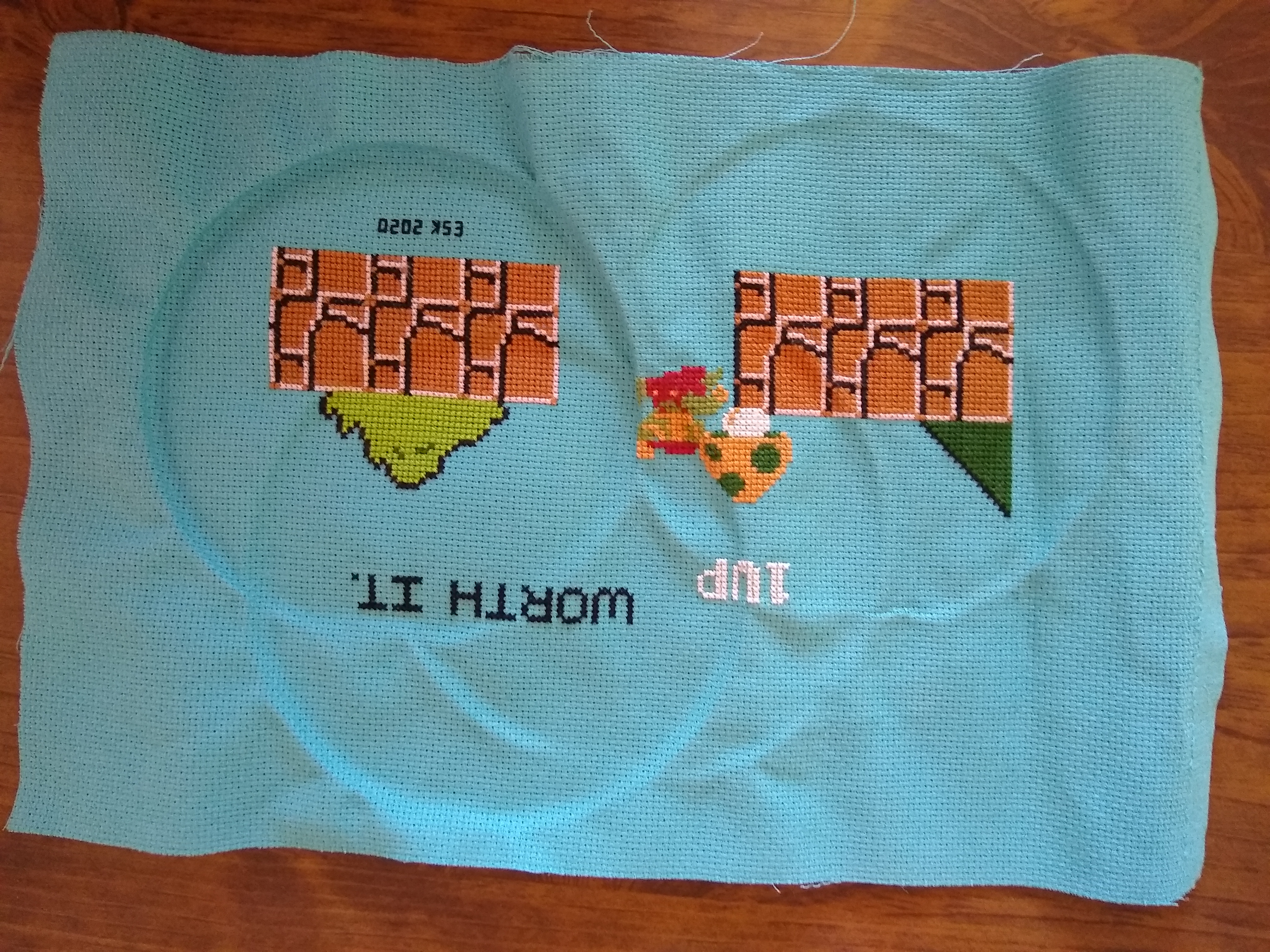 And just this morning, I finished what I plan to submit as a prize for SGDQ 2020. Just dropped it off to be framed this afternoon, so we'll see how the finished project looks, but I like how the stitching part came out. And I get to take credit for the pattern on this one. Sat down with an emulator for about half an hour playing and replaying the bit by the first pit in 1-1 to try to get the right shot. Had it slowed to about 1% speed and ended up basically taking a series of screenshots each frame to get exactly what I wanted (which was Mario grabbing the 1-up while dying. Let's face it, we've all died going for a 1-up or expending most of our health to get a refill, and this picture is celebrating that). Time was of the essence for this one, since I need to get it submitted in time (talked with the framers and they're giving it the priority to have it done in time), so I ended up working on it more than just my usual hour a day, but that's okay. I enjoy doing it and got to watch a lot of movies as I worked.