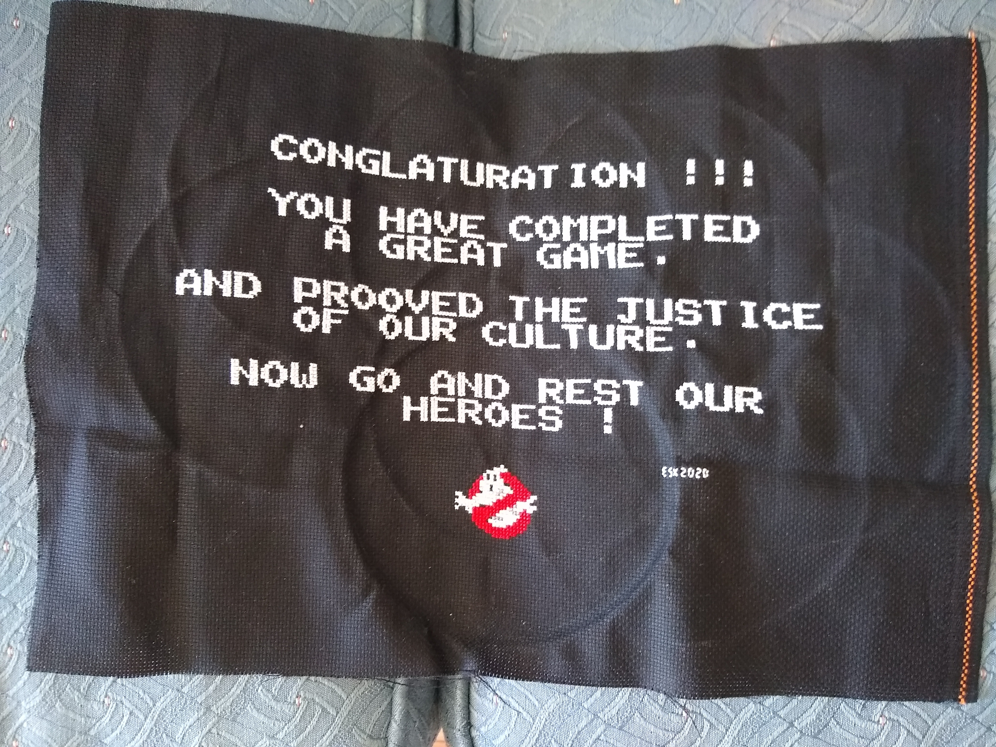 And, with Godzilla done, we turn our attention to AGDQ 2021 https://gamesdonequick.com/ . It'll be online only again, obviously this virus isn't going away any time soon, and scheduled to run Jan. 3-10. Prizes aren't being accepted quite yet (starting November 8), but the sooner I get started on this, the sooner I can have it in the hands of The Artery to ensure I have the final product back in time. One of the blocks/groups of games at AGDQ is the "awful block": terrible games or ones with some glaring flaws, the B movies of video games we love because of their cheesiness. So my prizes have featured some bad (good?) Engrish from NES games fitting that idea. This year's is no exception. Ending screen from Ghostbusters. I almost went with the ending of the Japanese version of the game, just because it's Engrish is even worse, but I decided to go with the US version. A) After looking back and forth, there was only one word different (in the Japanese version, we have completed a "grate" game), B) most people watching are prolly going to be more familiar with the US version and C) we expect non-natives to have trouble with English. When it was brought to the US and translated into English, some one should have caught that there were more mistakes than just "grate". The logo actually isn't on the ending screen, I added that in. First reason was to give some indication of the game in question. Also wanted there to be something besides just the text. But the logo is taken directly from the game. Had to flip it to get it facing the right/usual way, but otherwise haven't modified it. But this should be a fairly simple and straightforward pattern to do. Figure I can bust it out in a couple of weeks or so, prolly closer to three. But should be done in plenty of time to get it shipped off. And then we can get back to Zelda. :)