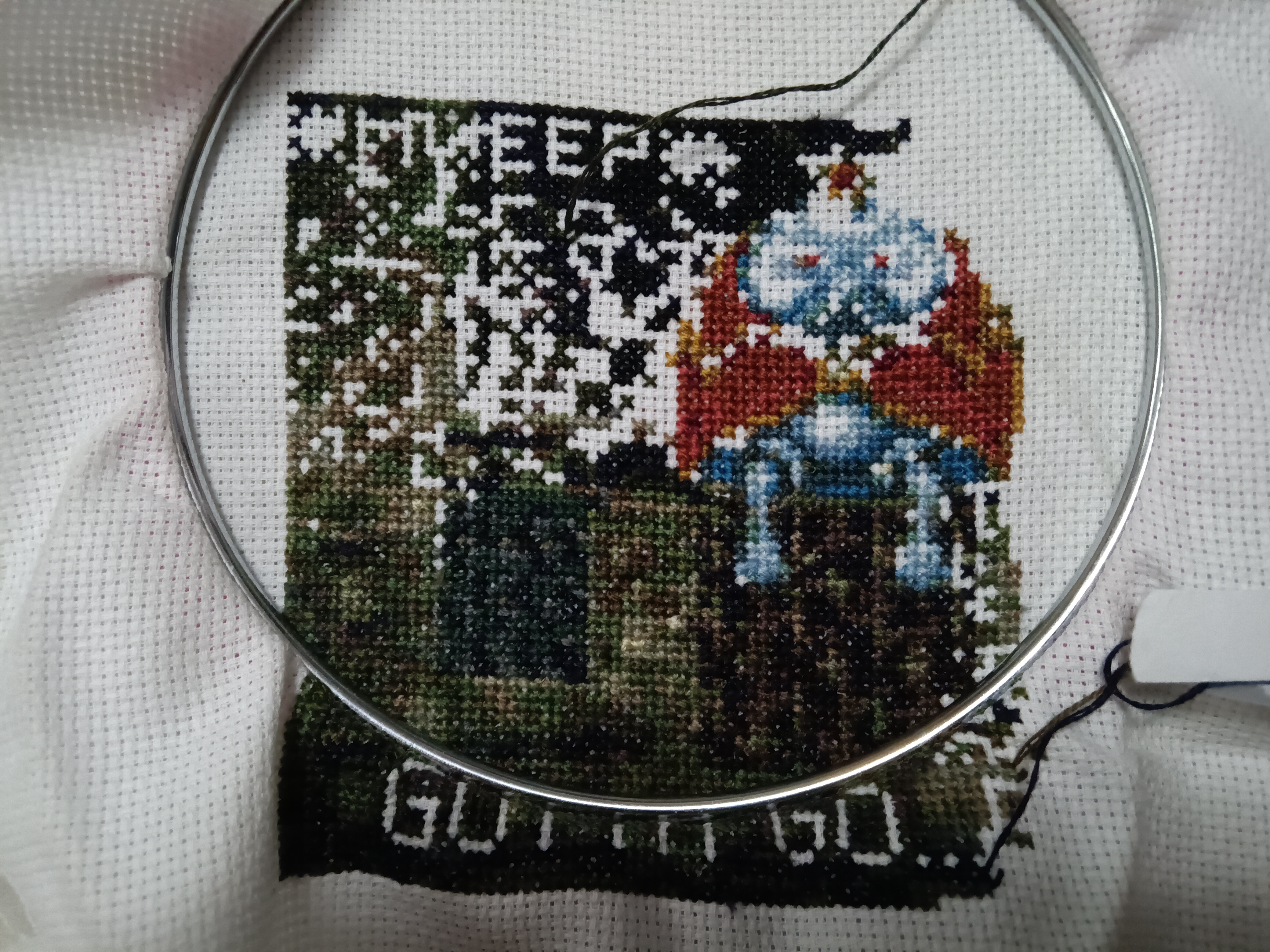 Not fair to compare the work done in the first pic to the second since the second had essentially an extra week's worth of work done, doing 90 minutes a day rather than 60. But because of that, yeah, we have gotten a lot done. Still a lot of little gaps and spots, but I also see a lot that has filled in. I think because I haven't moved the hoop yet, I'm psyching myself out and I really have done more than I think, but we'll see later this week/next week once we move the hoop up and get the top border identified/stitched. Once I do that, I think I'll have a much better idea of how far along I've come, and how much I still have to do. End of this week would be 5 weeks working on this, or the halfway point, so theoretically, I ought to be about halfway done then. The left side of the O in "go" is our halfway point horizontally and the top of King Zora's legs/base of his body is about the halfway point vertically, so we can see that much of that has been stitched. Whether I fill all that in by the end of the week remains to be seen, but I have done work outside that square, so total number of stitches is near/over halfway already. At this point, unless I start feeling burned out or not enjoying things anymore, I'll keep to 90 minutes a day until we finish and if we wrap up early, so much the better to give The Artery a few extra days to get it framed. But we'll see what the next few weeks bring.