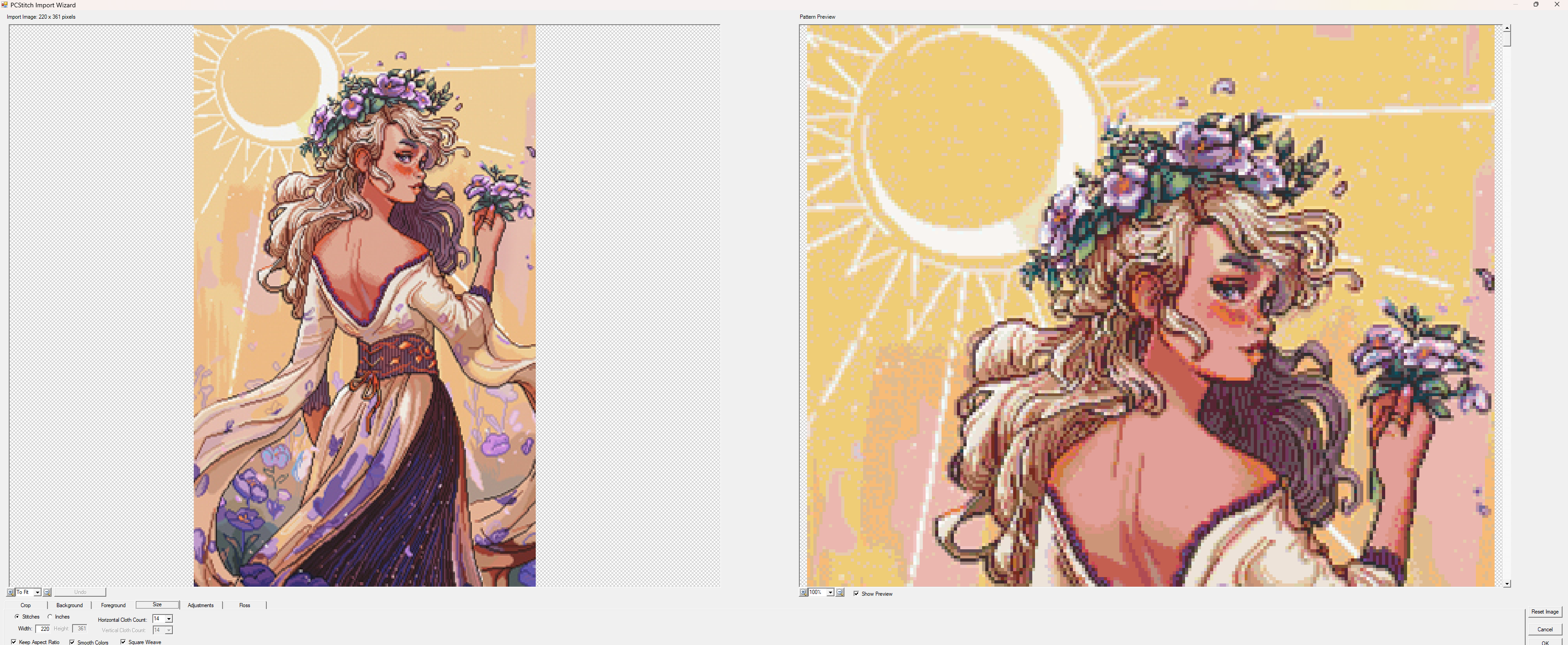 Would it be okay if I asked more about the progress? I would really like to learn a bit more so i can to that by myself :c I resized the image in photoshop to the amount of diamonds and then imported that to pcstitch and changed the size to the amount of diamonds but it still had those grey areas. If you could guide me a bit more in the process of what im doing wrong I would really appreciate it :grin: