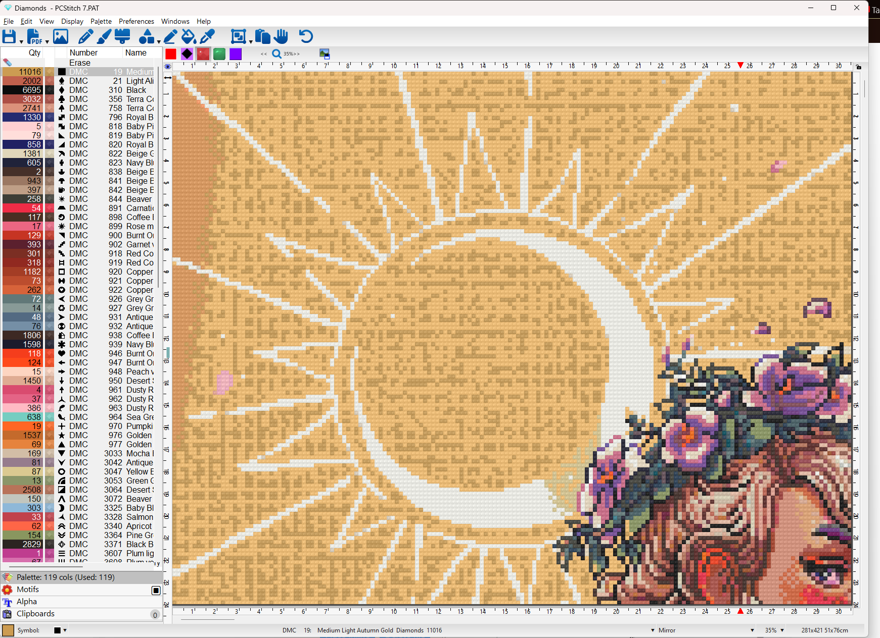 Hi! thanks for the update! I hope you are healing better. Sorry for the late reply, I also went into surgery on sep 10 so I couldnt check this out! So I tried taking the full picture and counting the diamonds (281). I placed the full picture on pcstitch and even put the numbers of colors to 999 but I dont know why it isnt working for me :c. I attached the pictures bellow! of the counting of the diamonds and what it looks like in pcstitch