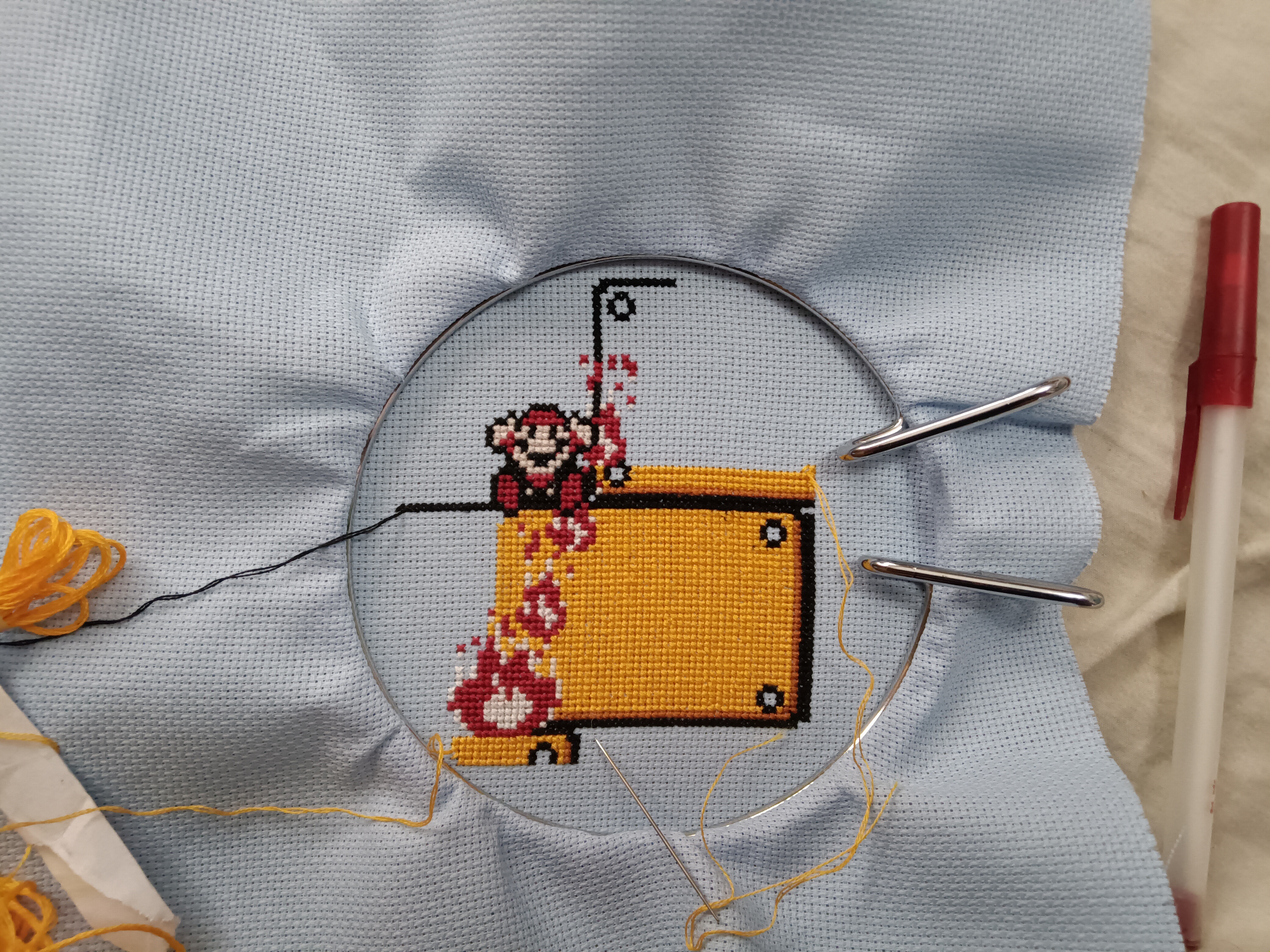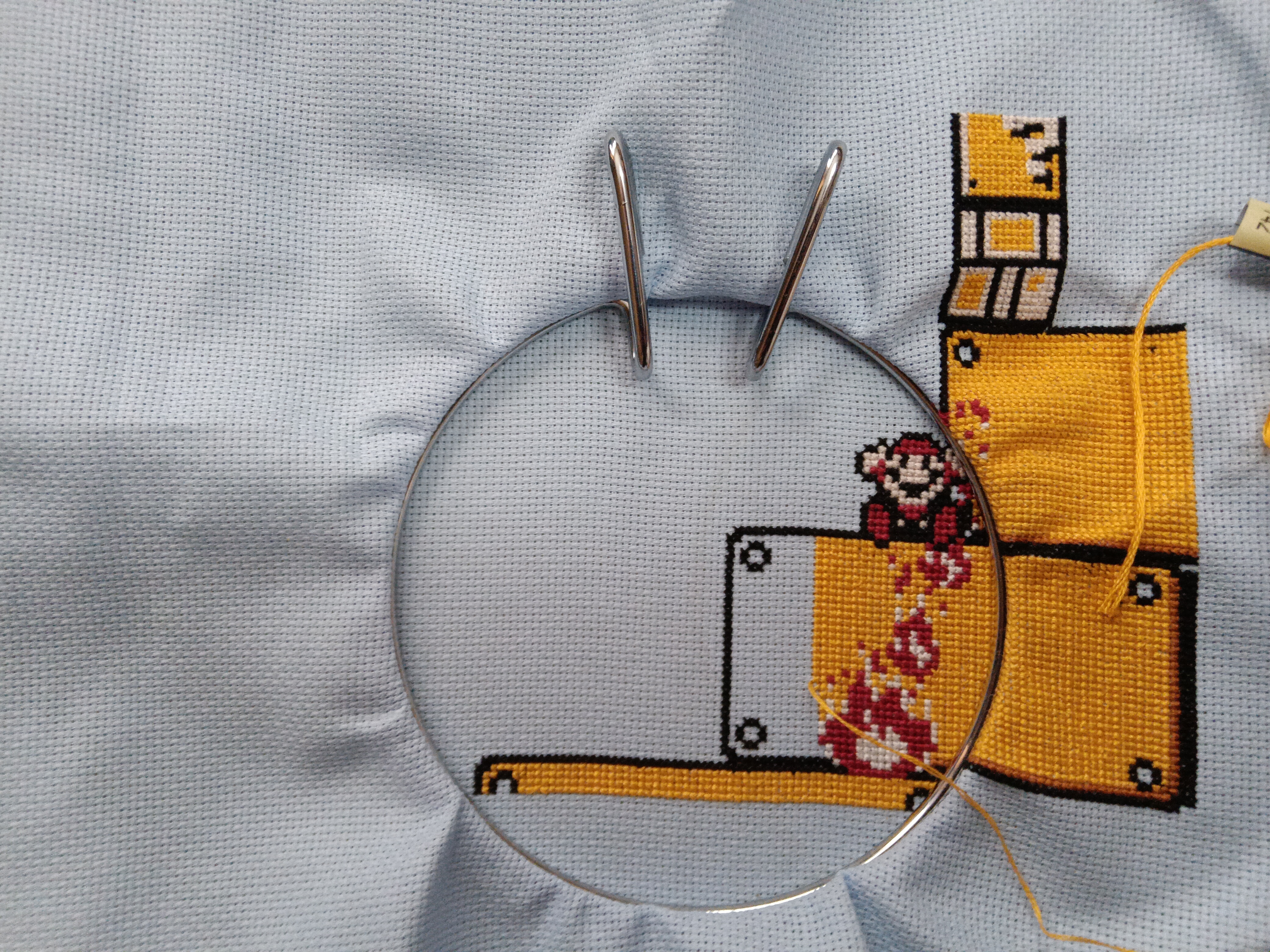 Still have a ways to go, but progress is being made. 18 hours in now, including today's work. Filling the rest of the block we're working on will take another 4 or 5 hours prolly, And still have filling the left side of the two bottom blocks. Plus the question block and breakable block up top. And the text. So I'm still saying mid-March is a reasonable goal at this point. Mario and the fireball are both done, though, so we have checked off a couple of things. In fact, I'm done using both the white and red thread for this picture. Last time I used a Mario screenshot (SGDQ 2020), I used a little darker light blue piece of cloth and I think I like that more, but what we have here works. Not quite as bright as the actual game, but I doubt anyone is going to complain. And we did successfully set ourselves up to do fill work last weekend and I was able to get some stitch time in. Computer has been acting up a little lately, so thinking about taking it in this week. May be without it for a little bit, but again, planned for this in getting the boundary of this current block at least established so we can just spend most of this week mindlessly filling. But pleased with how things have been going so far, glad you guys have something definite to look at and we'll se how the next couple of weeks go.