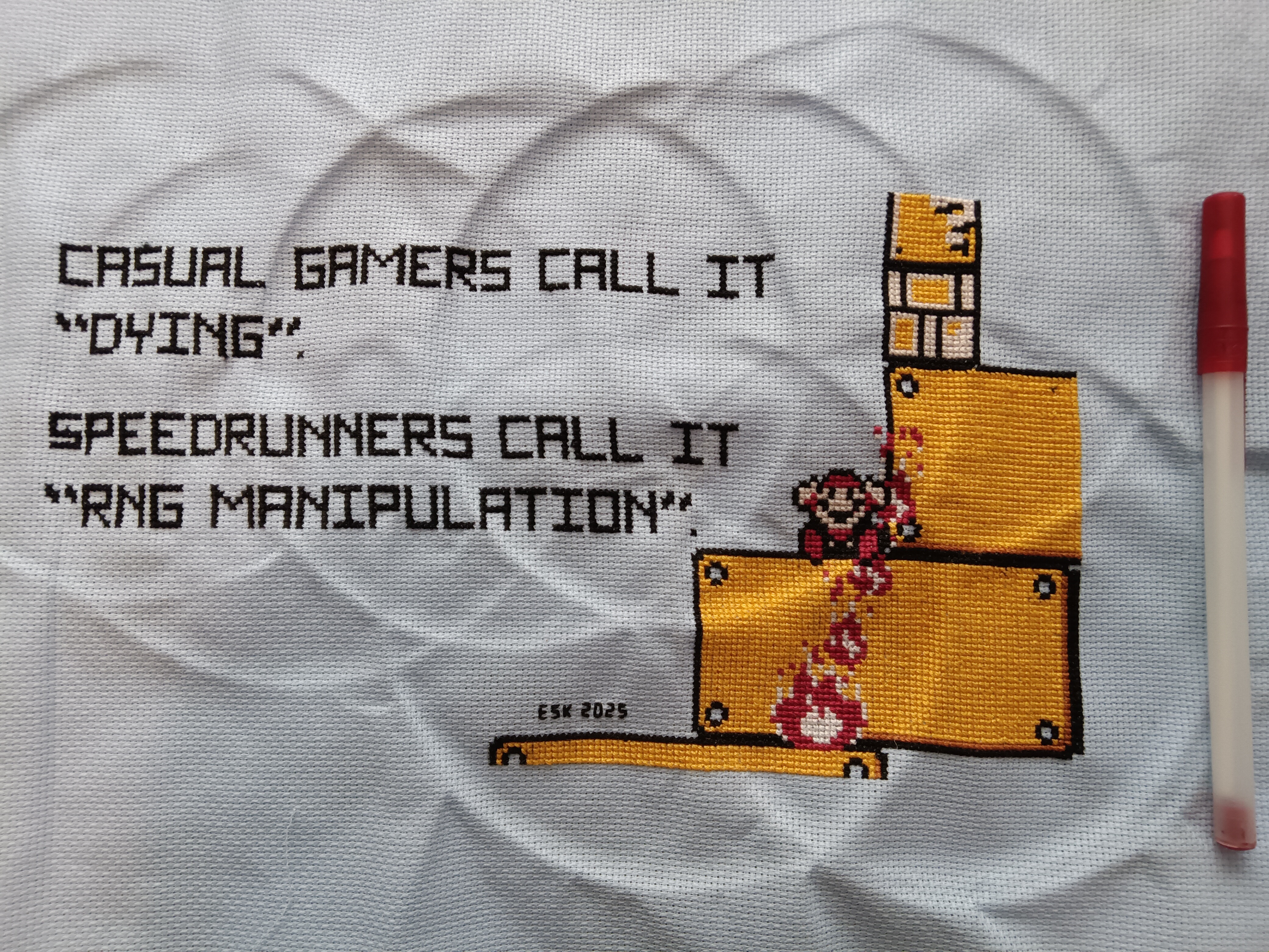 Once we finish, though, we aren't actually going to jump right into our AGDQ prize. Got an idea for another project that has a stricter timeline, so want to do it first. Frankly, it comes up before SGDQ, too, but A) I was already over halfway done with that when I thought of this new idea and B) still need to design said idea. Once I know what exactly I'm going to do/have it designed, I'll share more info with you guys. But I'm anticipating that not being a very big project, so something I can bust out in two or three weeks. May try to push things a little as I'd like to have it framed and back by early May. So that'll be next project. And then we'll bust out AGDQ 2026 in prolly two weeks, get that wrapped up and then back to Spirit Tracks, which will likely be our sole focus for the rest of this year/early next year until it is finished. Long way out, so we'll see where we are next January/February and whether we want to push to finish it, then take our usual GDQ break, or realize we still have a fair amount to do, so just take our usual break and then finish at our normal/comfortable pace. But that's months from now, cross that bridge down the road. Focus for now is wrapping up stitching SGDQ 2025 by next Saturday.