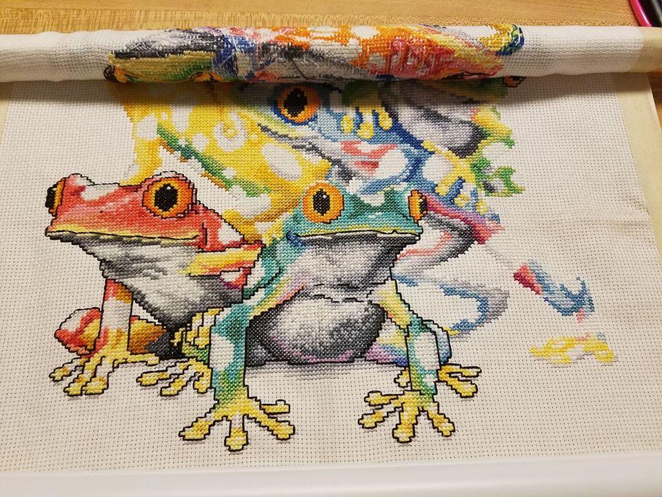 I've been working on this project for over 2 years now. I kept stopping and changing what I was working on and then I ended up moving back to the United States, where all my cross stitching things due to the lack of time to work on it went into the crawl space in boxes. Now that I have more time and want to work on it. I've gotten back to stitching again and I'm going to finish this one first before anything. Frogs are my favorite animal in the world and that's why I picked this particular piece. Hopefully I can finish a few other stitches that I've started while I was overseas.